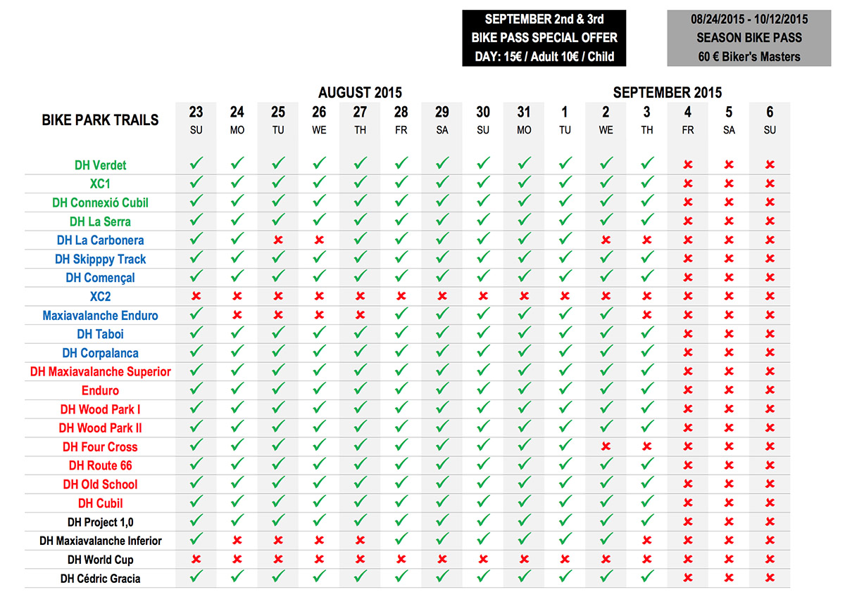 In total, 40km downhill with a drop over 1,000m. During the season, put up three lifts providing access to all 17 circuits of different levels: the telecabine of La Massana that leaves from the town center at 1,300m and arrives in La Caubella at 1,950m; and two detachable chairlifts, La Serra II and Cubil, this one reaches the highest point of the Bike Park, at 2,350m.